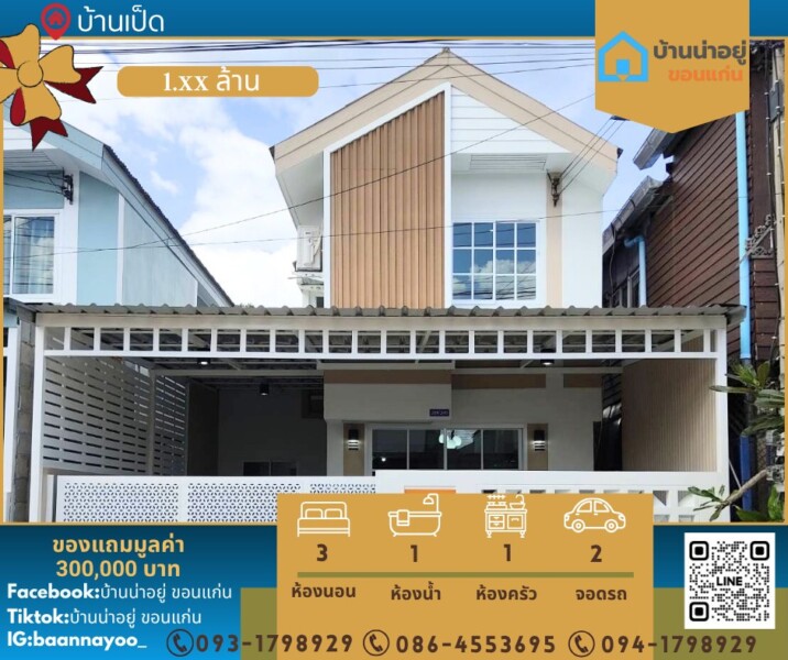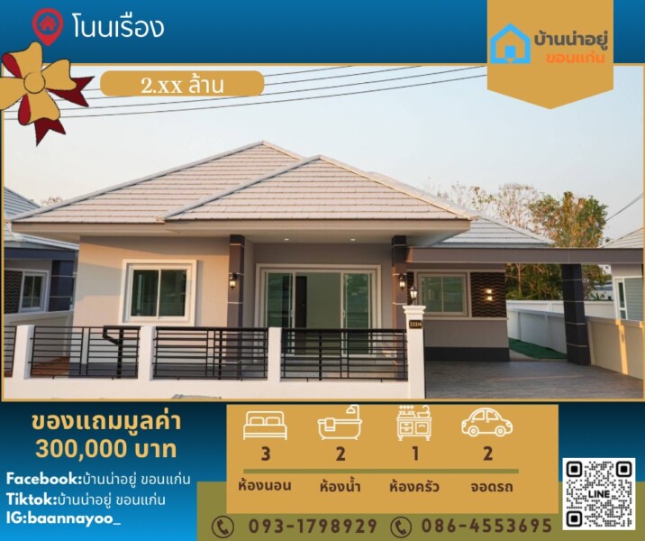 บ้านเดี่ยว 3ห้องนอน 2ห้องน้ำ 1ห้องครัว 2ที่จอดรถ พื้นที่กว้างขวาง เพดานบ้านสูงถึง 3.4 เมตร