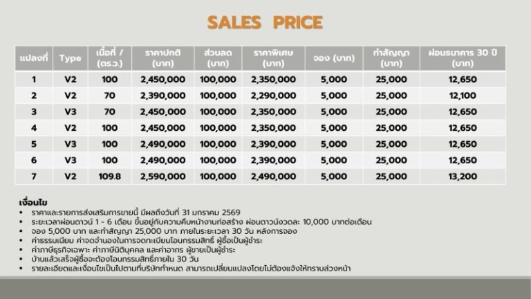 ราคาเริ่มต้น 2.29-2.49 ลบ. พื้นที่เริ่มต้น 70-109.8 ตารางวา