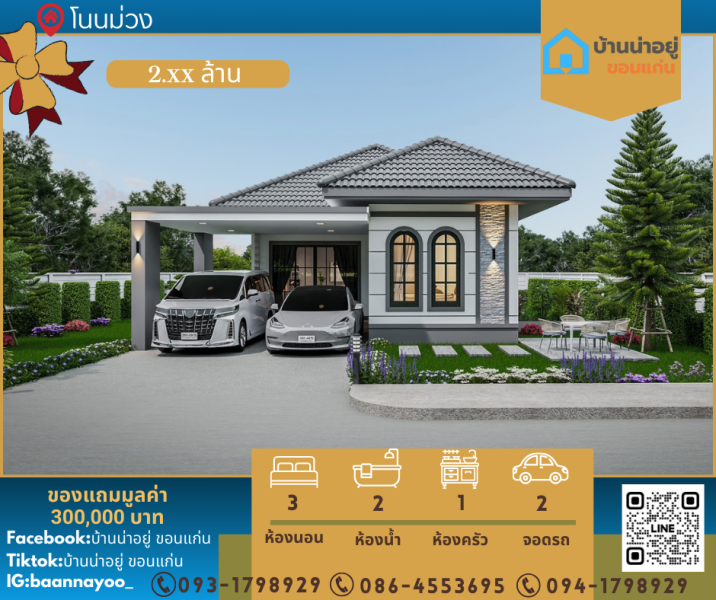 ขาย บ้านเดี่ยว [HKK085]✨ด่วน!!! เปิดจองด่วน บ้านเดี่ยวชั้นเดียว บ้านโนนม่วงหลังมข. ฿ 2,690,000 เช่า -1/เดือน พิกัดโนนม่วง 3 ห้องนอน 2 ห้องน้ำ 2 คัน